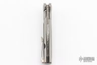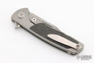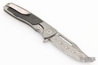 This Mini EVO Flipper from Brian Nadeau features a Damasteel blade with a fullers, thumbhole, flipper and notched thumbrest. The handle is comprised of a bead blasted titanium frame with carbon fiber inlays, satin titanium tip up clip. Rides on bearings, nice detent, lockup and blade seating, stainless lockface insert. Has a couple light scuffs, and scratches otherwise excellent condition.