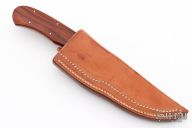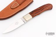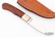 This Hunter by Corbit Sigman features a mirror finished blade with a full tapered tang construction, .144" blade stock and .843" blade depth. The handle has nickel silver dovetailed bolsters with cocobolo scales and nickel silver pins. Includes a brown leather sheath. Excellent Condition.