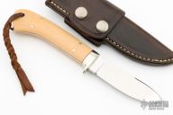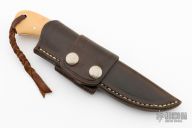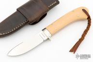 This Semi-Skinner by Jerry Langbein features a mirror finished blade with a false top edge and notched thumbrest, .152" blade stock and .973" blade depth, full tapered tang construction. The handle has a nickle silver guard and vintage Westinghouse paper micarta scales with red liners. Comes with a brown leather sheath. Has a few light scratches, otherwise excellent condition.