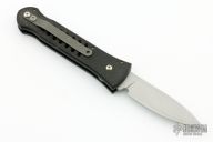 This Street Fighter side-opening automatic by Rob Dalton features a bead blast blade. The handle has a black G-10 frame with tip up bead blasted titanium clip. Strong and fast coil-spring opening. Has a few light scuffs, otherwise excellent condition. Comes with a zippered case.