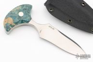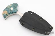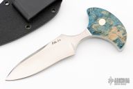 This push dagger by Mike Irie features a hand rub satin finished single edge blade and dyed and stabilized maple burl scales, .255" blade thickness and 1.130" blade depth. Comes with kydex sheath. Excellent condition.