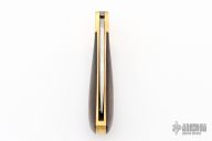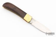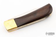 This Vintage Lockback by Ralph Bone features a satin finished blade with nail nick. The handle is comprised of brass dovetailed bolsters and mesquite wood scales, brass liners and steel backspacer. Stamped J886 on blade. The bolster reads "JRJ". Has some light scratches and patina, otherwise excellent condition for its age.