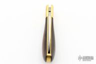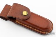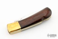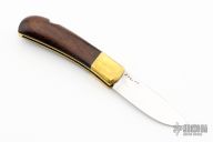 This Vintage Lockback by Ralph Bone features a satin finished blade with nail nick. The handle is comprised of brass dovetailed bolsters and cocobolo wood scales, brass liners and steel backspacer. Stamped J78.22 on blade. Has some light scratches, otherwise excellent condition for its age. Comes with original brown leather sheath.