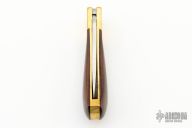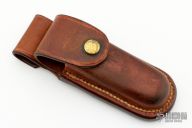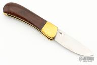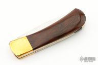 This Vintage Lockback by Ralph Bone features a satin finished blade with nail nick. The handle is comprised of brass dovetailed bolsters and rosewood scales, brass liners and steel backspacer. Stamped J946 on blade. Has some light scratches, otherwise excellent condition for its age. Comes with original brown leather sheath.