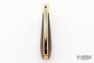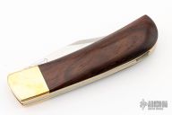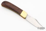 This Vintage Lockback by Ralph Bone features a satin finished blade with nail nick. The handle is comprised of brass dovetailed bolsters and rosewood scales, brass liners and steel backspacer. Stamped J912 on blade. Has some light scratches and patina, otherwise excellent condition for its age.