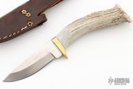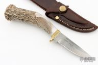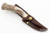 This knife by Pete Dunham features a satin finished blade with .113" blade stock and 1.015" blade depth, hidden tang construction. The handle has a brass guard and crown stag grip. Comes with a brown leather sheath and zippered case. Has a few light scratches, otherwise excellent condition.
