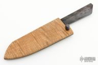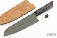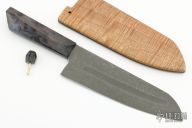 This Santoku by Farias Knives features a acid stonewashed S35VN blade with a 62 HRC, has fullers, .125" blade stock and 2.243" blade depth, hidden tang constrution. The handle has dyed and stabilized bird's eye maple burl wood grip, black paper micarta frame & micarta pin. The scabbard is made from Hawaiian mango with a pin that matches the handle. New from maker at the 2023 USN Gathering.