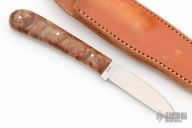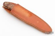 This Desk Knife by the Late Tony Bose features a satin finished Zulu Spear blade with .09" blade stock and .689" blade depth, full tang construction. The handle has very nice burl  scales. Includes a brown leather sheath by Parsons. This knife was made for the NKCA. Has a couple light scuffs and scratches, excellent condition otherwise.