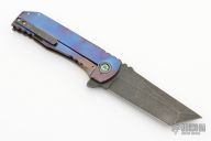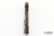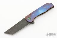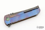 This F-16 Framelock Flipper by Robert Carter features a dark stonewashed tanto blade with a notched thumbrest. The handle has an anodized titanium frame with zirconium pivot collars and a matching tip up pocket clip.  There are three mokuti inlays in the frame.  Andoized titanium backspacer.  Excellent Condition.