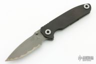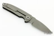 This TAD Dauntless framelock folder by Warren Thomas features a bead blasted and anodized chisel ground titanium blade with a carbidized edge, and a black G10 and bead blast finish titanium frame with matching tip up titanium clip. Notched thumbrest. Nice lockup and blade seating. Very nice work. There are some scuffs, otherwise excellent condition.