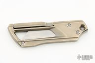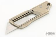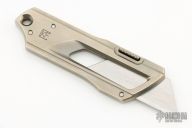 Custom Knife Factory Anton Malyshev Kanza Utility Knife, Replaceable Standard Utility Blade, Machined Titanium Handle. It's tough enough to withstand cutting drywall, gypsum boards, roofing materials, plastic, wood, cardboard, paper, and linoleum while remaining as flat as physically possible. Two-hand opening design. Excellent Condition.