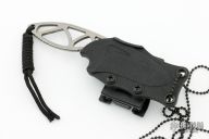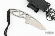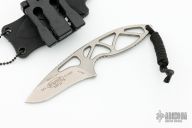 This Medallion neck knife has a stonewashed blade with notched thumbrest, .161" blade stock and 1.40" blade depth, full skeletonized tang construction. Dated 07/2001 and s/n 0363. Includes original sheath, box and papers. Excellent condition.