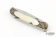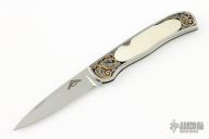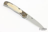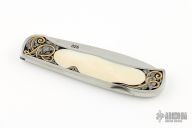This Interframe Lockback from Warren Osborne features a hand rub satin finished blade with nail nick. The handle has a stainless steel frame with gold lip pearl inlays, and gold inlaid engraving done by Sam Alfano. Excellent condition. #026