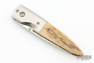 This knife by Ferenc Tumpek features a mirror finished drop point blade with a single thumbstud and fileworked spine. The handle has satin stainless bolsters, mammoth ivory scales with red liners, anodized and fileworked titanium liners, and a fileworked mammoth ivory backspacer with red liners on either side. Excellent condition.