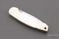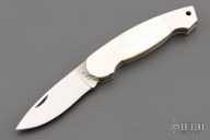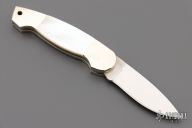 This Slipjoint by Jimmy Lile features a satin finish blade with nail nick, nickel silver dovetailed double bolsters with integral liners, gold lip pearl scales. Has a few light scratches, otherwise excellent condition.