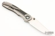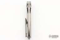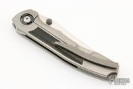 This D.U.K. by Kody Eutsler features a satin finished blade with dual zirconium thumbstuds. The handle has a zirc blasted titanium frame with black canvas micarta inlays, zirconium pivot collars, tumbled titanium backspacer and tip up clip with hidden screws. Rides on Skiff bronze washers, comes with original bearings as well. Nice detent, lockup and blade seating. Comes with a zippered case. Excellent condition.