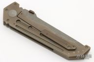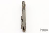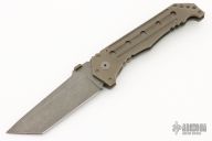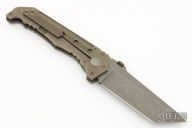 This knife features a tumble finished tanto blade with swedge, notched thumbrest and flipper. The handle has a tumbled anodized and tumbled finished titanium frame with a matching tip up pocket clip. Blade is centered when closed, strong detent, and locks open with no movement/play. Includes a padded zipped case.  Light scuffs and scratches are visible otherwise the knife is in excellent condition.