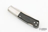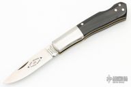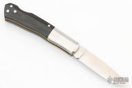 This lockback by Parker Cutlery Company is a Yoshi Aida design, it has a satin finished blade with nail nick. The handle has stainless steel bolsters, red/black papers micarta scales, brass liners, stainless steel backspacer. Has some patina, otherwise excellent condition.