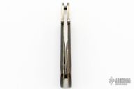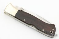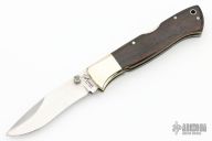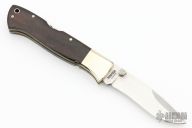 This Mamba Lockback from Blackjack Knives features a satin finished recurve blade with dual checkered thumbstuds. The handle has nickel silver bolsters, liners, and pins. The handle has wood scales and a stainless rockerbar. Has some light scratches and a small nick in the blade, otherwise good condition.