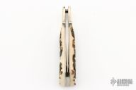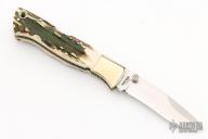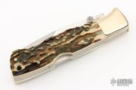 This Mamba Lockback from Blackjack Knives features a satin finished recurve blade with dual checkered thumbstuds. The handle has nickel silver bolsters, liners, and pins. The handle has stag scales and a stainless rockerbar. Excellent condition.