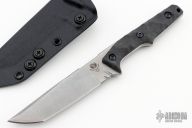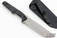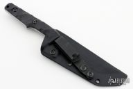 This Skraeling from Bawidamann Blades features an Acid Etched Silver finished tanto blade with swedge, notched thumbrest and fileworked ricasso, .155" blade stock and 1.095" blade depth. The handle is comprised of sculpted IM Bawidamann Chunked Pattern Carbon Fiber scales (proprietary Carbon fiber composite) over full tang construction. Lanyard hole in pommel. Includes kydex sheath. New from maker.