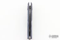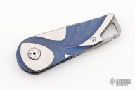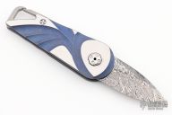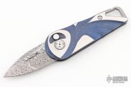 This Mini Auto by Brian Tighe features a Damasteel finish blade with false top edge. The handle has a tumble/satin/anodize finish and milled titanium frame with blasted finish carabiner style clip. Fast opening, strong lockup. Comes with a zippered case. New from maker!