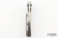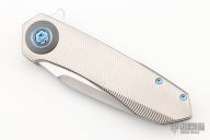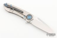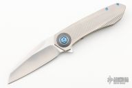 This Drifter flipper from Steven Skiff features a hand rub satin finished blade with flipper. The handle has a milled and bead blast finished titanium frame with zirconium tip up clip, pivot collars and backspacer. Very smooth action on Skiff Bearings with a nice detent, lockup and blade seating. Includes nylon zippered case. Excellent condition.