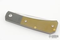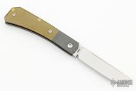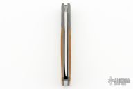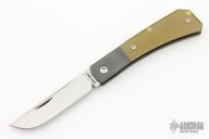 This Pioneer Jack slipjoint (Farmer's Knife) by Jack Wolf Knives features a satin finished clip point blade with nailnick. The handle has integral bead blast finish pinched, fluted, titanium bolsters with Fat Carbon covers and a stainless spring. Comes with box, metallic tube with Sean Tiffany artwork, leather slip, and cloth. New from maker!