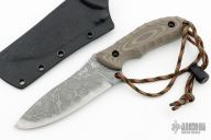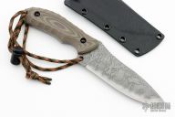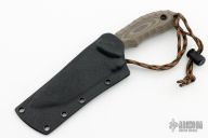 This Aoba by Kiku Matsuda features an acid etched blade with notched thumbrest, .156" blade thickness and 1.619" blade depth, full tang construction. The handle has G-10 scales. Comes with kydex sheath. Excellent condition.