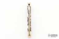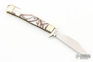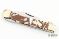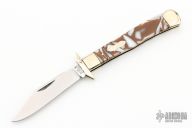 This Swing Guard Lockback from Bull Dog Brand Knives features a tumbled and polished blade with nail nick. The handle is comprised of nickel silver bolsters and cap, acrylic covers over brass liners and stainless steel backspacer. Has a few light scratches, otheriwse excellent condition. Dated 2006
