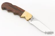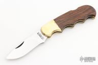 This lockback by Gerber features a satin finished drop point blade with nail nick. The handle has a brass frame with wood inlays. Has a couple light scratches, otherwise excellent condition for its age. Comes with original brown leather sheath.