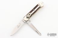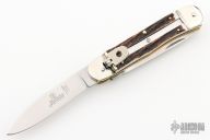 This knife by Hubertus is unique, it features mirror polish finished blades. The handle has nickel silver bolsters, stag scales, brass liners and steel springs. Has stag covers. Comes with original box and papers. Has some light scratches, otherwise excellent condition.