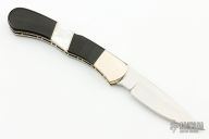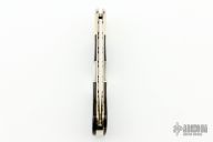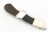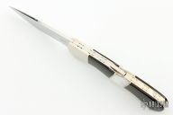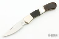 This Buck 532 features a mirror finished blade with nail nick. The handle has mirror polished nickel silver bolsters with integral liners that are fileworked, water buffalo and mother of pearl inlays, stainless steel backspacer. Comes with original leather sheath, box and papers. Excellent condition.