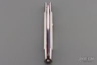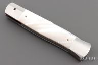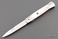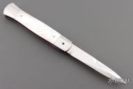 This Side opening auto by Burn Knives features a mirror polished bayonet style blade with false top edge. The handle has stainless steel double bolsters, mother of pearl scales over anodized titanium liners, black lip pearl button, stainless steel backspacer. Excellent condition.  Comes with a zippered case