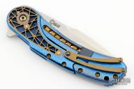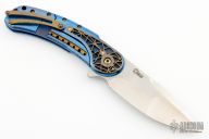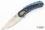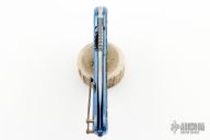This Bodega from Begg Knives is a one off. It features a satin finished blade with swedge, notched thumbrest and flipper. The handle is comprised of a tumbled and anodized titanium frame with skeletonized and anodized titanium inlay over a notched and checkered titanium backspacer. Matching tip up clip and lanyard hole in pommel. Great blade seating, detent and lock up. Includes padded and zippered case. Excellent condition.