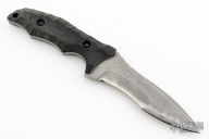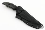 This Cyclone by Kiku Matsuda features a recurve blade with false top edge with notched thumbrest, .210" blade thickness and 1.243" blade depth, full tang construction. The handle has black canvas micarta scales. Comes with kydex sheath with belt clip. New condition.