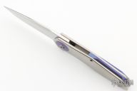 This Cluprit flipper from Steven Skiff features a hand rub satin finished blade with false top edge and flipper. The handle has a milled and bead blast finished titanium frame with anodized titanium tip up clip, pivot collars and backspacer, and anodized titanium hardware. Very smooth action with a nice detent, lockup and blade seating. Includes  zippered case. Excellent condition.