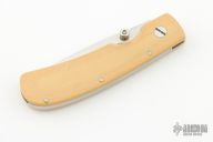 This liner locking folder by Mike Sanders features a mirror finished blade with single thumbstud. The handle has Westinghouse paper micarta scales, stainless steel liner and backspacer. Has scratches, knife does not lock open, lock liner slips with pressure, otherwise fair condition.