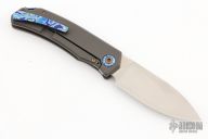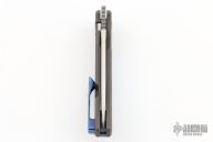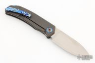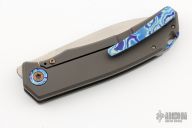 This Urban Dressed from Burger Knives features a hand rub satin finished drop point blade with notched thumbrest and front flipper. The handle is comprised of a bead blasted and milled titanium frame with black timascus inlay, pivot collars, tip up clip and backspacer. Includes a zippered case and COA dated November 2022. Excellent Condition.