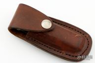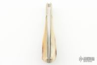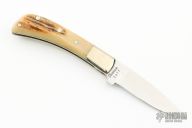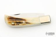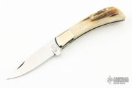 This slipjoint folder by Bill Thomason features a high polish blade with nail nick, dovetailed nickel silver bolsters, and stag scales, nickel silver liners and stainless steel spring. Half stop on blade, flush in all positions. Very nice work. This knife was made in the 1977. Excellent condition. Comes with a brown leather sheath.