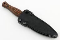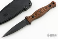 This Galvo Dagger by Les George features an Black ceracoated double-edged blade with .170" blade stock and .894" blade depth, full tang construction. The handle has black/orange G-10 scales and a lanyard hole. Comes with a black leather sheath by Chatanooga Leatherworks. Excellent Condition.