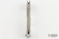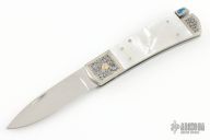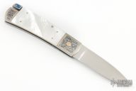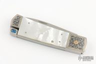 This Tail Lock by Ron Post features a hand rub satin finished blade with nail nick. The handle has engraved stainless steel bolsters with integral liners, mother of pearl scales, and stainless steel backspacer. The engraving has 24k gold inlays and was done by "C.J.H.". The tail lock has some clear blue stone inlay. Has some light scratches, otherwise excellent condition.