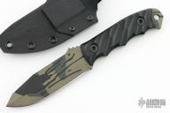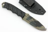 This Crow Jr by Half Face Blades features a green camo cerakoted drop point blade with a full tang construction.  .155" Blade Stock.  1.2" Blade Depth.  The handle is composed of contoured G-10 scales.  Comes with a kydex sheath, original box and papers.  Has some sheath marks otherwise excellent condition.