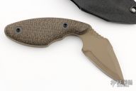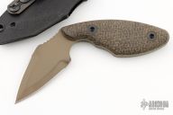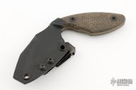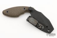This Punch Dagger by Half Face Blades features a green double-edged with a full tang construction and notched thumbrest, .159" blade stock and 1.253" blade depth.  The handle has burlap micarta scales.  Includes a kydex sheath.  Has a few light scuffs, otherwise excellent condition.