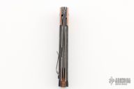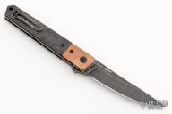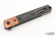 This Kwaiken is a Lucas Burnley design executed by Boker. It features a black stonewash finished blade with swedge. The handle has tumbled copper bolsters, marbled carbon fiber scales over black tumbled stainless steel liners and tumbled copper backspacer. The stainless steel tip up clip is positioned for right hand carry. Lanyard hole in pommel. Marked 0324 on blade spine. Includes the original box.  Excellent Condition.