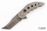This Tanto Homicide framelock flipper by Jeff Vandermeulen is the Prototype and and dated 1-2016 inside the frame. It features a Ladder Pattern Damascus blade with false top edge and a flipper. Handle scales are stonewashed titanium with ZircuTi pocket clip with hidden screws. Comes with a zippered case. Nice detent, lockup and blade seating. Excellent condition.