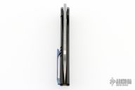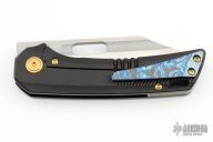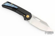 This Relative Framelock Front Flipper by EMP EDC features a satin finished clip point blade with notched thumbrest, front flipper, and a thumbhole. The handle has a black milled titanium frame, anodized titanium backspacer, hardware and Zircuti tip up clip. Rides on bearings, nice detent, lockup and blade seating. Has a couple light scuffs, otherwise excellent condition.