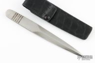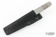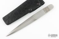 This knife by ITAC features a dagger style blade with nice hamon, .235" blade stock and .866" blade depth, full tang construction. Comes with a leather covered kydex sheath and zippered case. Has some light scratches and patina, otherwise good condition.