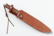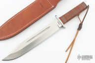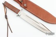 This Big Bowie by Hattori features a satin finished blade with false top edge and fullers, .267" blade stock and 1.552" blade depth, hidden tang construction. The handle is stacked leather with white spacers, and stainless steel double guard and butt cap with lanyard hole. Comes with brown leather sheath. Comes with original box and papers. Excellent condition.