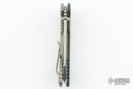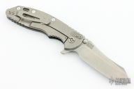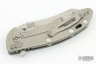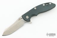 This XM-18 Skinner from Rick Hinderer Knives features a 3.5" blade, notched thumbrest and flipper, dual thumbstuds. The handle has a black/green G-10 scale, and stonewashed titanium handle, tip up or down pocket clip, fuller tab and standoffs. Clip can be mounted for tip up or down carry. Nice lockup, seating, and detent. Has been resharpened, otherwise excellent condition.